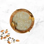 A beautifully crafted round tray featuring a wooden frame, intricate golden leaf accents, and a glass base with a delicate floral and bird motif. Perfect for serving or as a decorative piece.