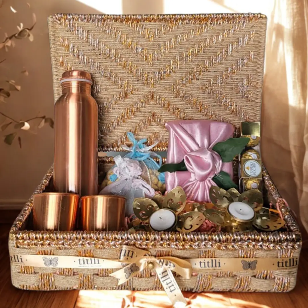 A beautifully woven basket filled with copperware, chocolates, festive candles, and more – this hamper is a thoughtful mix of tradition, health, and indulgence. An ideal gift for Diwali, weddings, and special occasions.